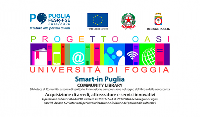 Nell’ambito del progetto OASI ideato dall'Università di Foggia e finanziato da Fondo sociale Europeo e Regione Puglia attraverso Puglia Fesr-Fse 2014/2020, i locali del front office e la sala lettura della biblioteca di area economico-giuridica sono stati completamente ripensati e ristrutturati attraverso l’allestimento di nuovi spazi, nuovi arredi e attrezzature. Altri interventi previsti nel progetto sono consistiti e consisteranno nel potenziamento dei servizi on-line, di nuovi strumenti per la fruizione dei servizi, di nuove tecnologie per la tutela del patrimonio nonché nell’acquisizione di strumenti di ausilio per ipovedenti e non vedenti. Il finanziamento è stato erogato nell’ambito dell’avviso pubblico della Regione Puglia “Smart in Puglia Community Library” per il sostegno e il rilancio del patrimonio culturale pugliese.