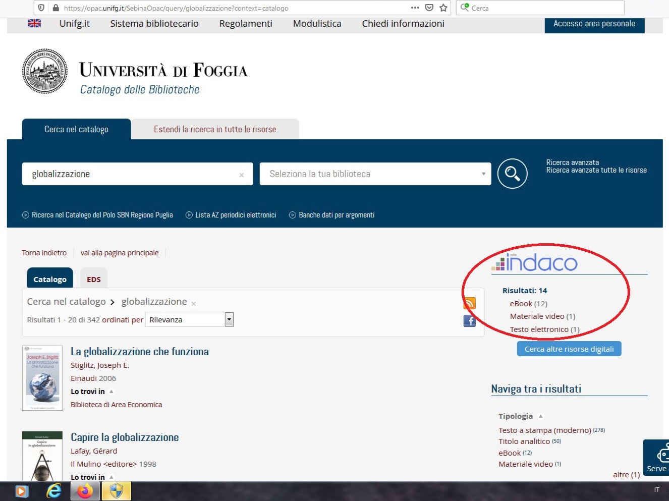 Grazie all’accordo tra il Sistema Bibliotecario dell’Ateneo di Foggia e DM Cultura, tra i documenti ricercabili dai consueti canali di ricerca dell’Opac Unifg è ora possibile visualizzare tra i risultati anche quelli provenienti dal patrimonio digitale di ReteINDACO.